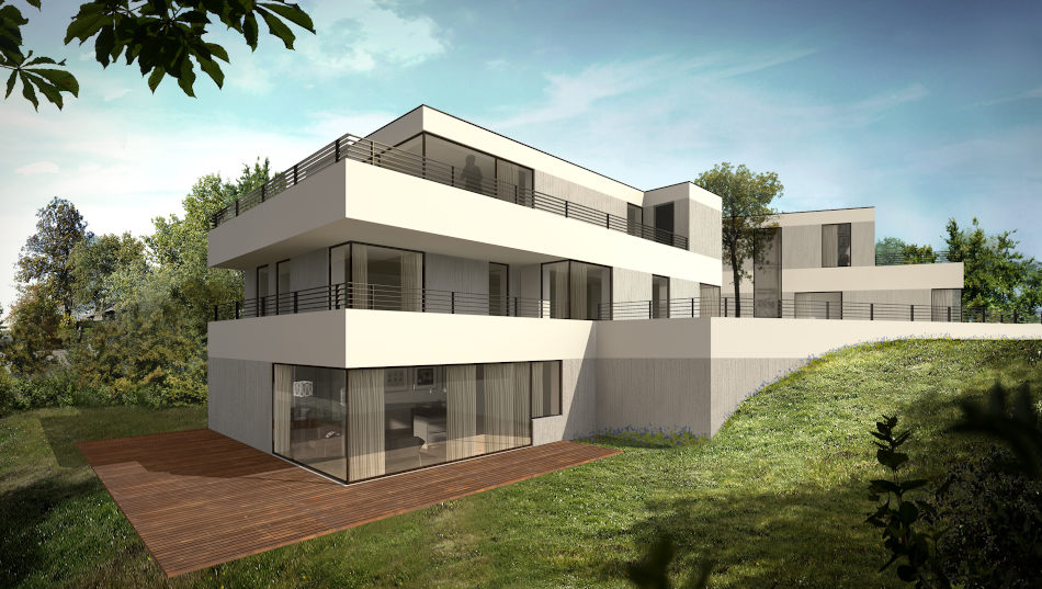 A prize-winning visualisation for a two-family house displays how a sloping plot can be utilised in providing a maximum in private sphere. The stacked living units face away from each other on different height levels, while each apartment features its own garden space.