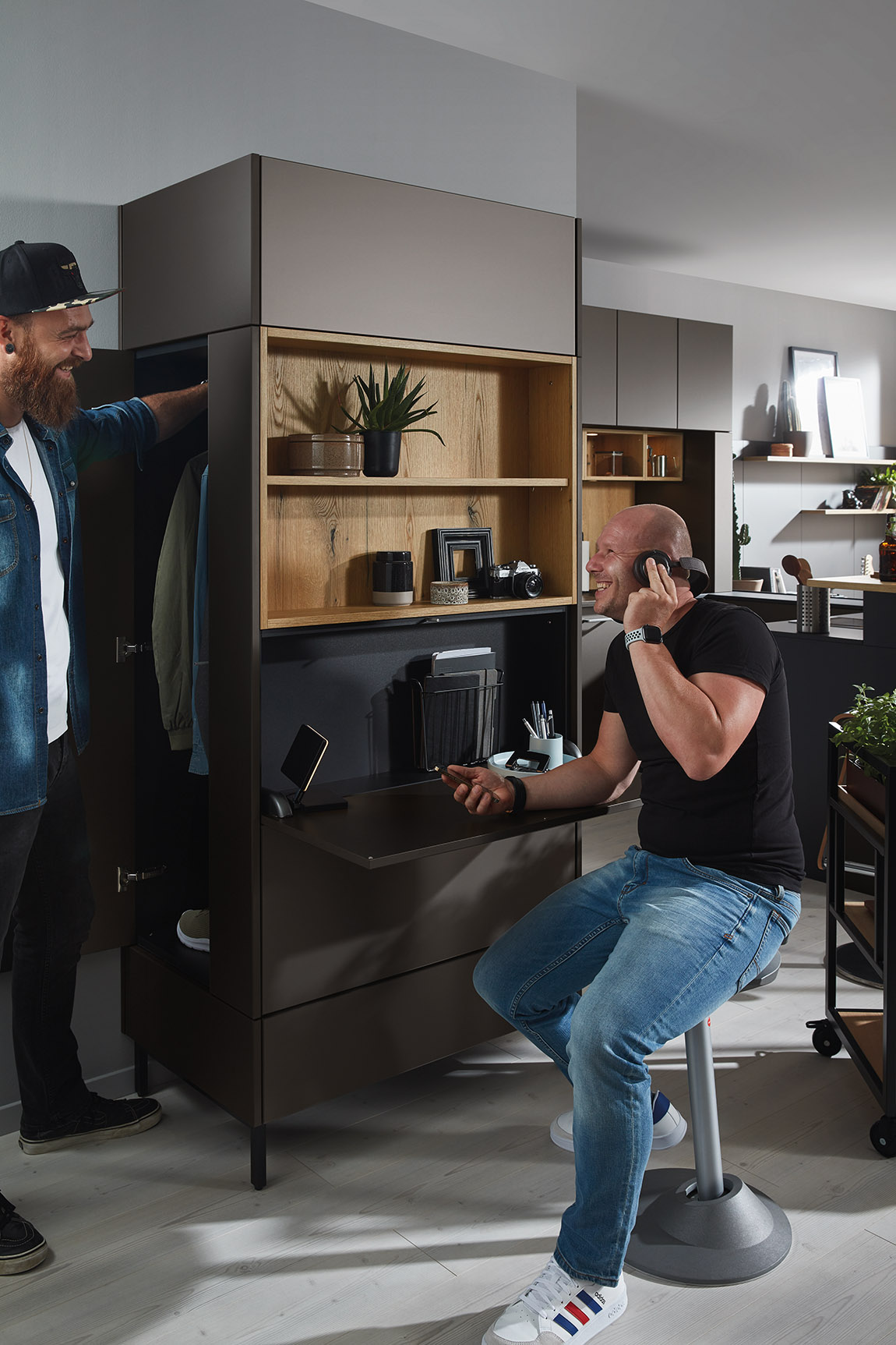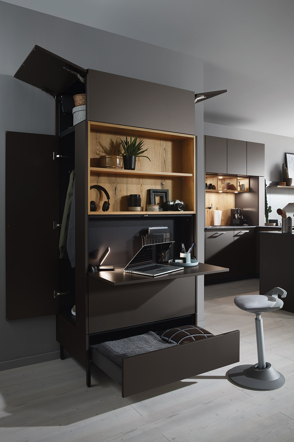 Ballerina kitchens stand for elegant design and superior durability. All models offer maximum use of storage space and optimum functionality. The multifunctional HOMETOOL is a perfect example. “The HOMETOOL can be easily converted and is a wardrobe and desk in one. It offers plenty of storage space and can also be used as a bar. A true all-rounder that, thanks to its clear design, is a real eye-catcher in any home.”