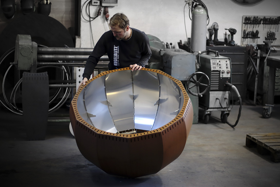 Ein weiterer Vorteil: Die Kugelblitze können ganzjährig draußen stehen. „Unsere Klassiker aus Edelrost sind mit einer Außenhaut aus Cortenstahl gefertigt. Diese Art Stahl rostet an und versiegelt sich damit von selbst. Und für die Grillplatte aus 10-12mm dickem Stahl gilt: Je öfter auf ihr gegrillt wird, desto widerstandsfähiger wird sie”, ergänzt Weinfurtner.