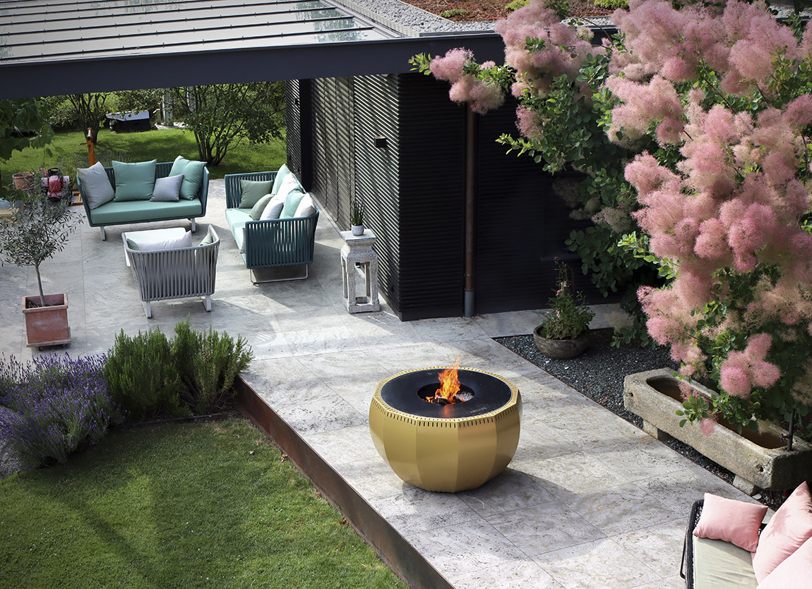 His Kugelblitzes are made to order. They are available in different colours (vert antique, black matt and sarant grey and almost all RAL colours), variants and sizes: as straight grills or as grills with an integrated fire pit. Depending on the size, the Kugelblitzes are suitable for small or larger terraces or for the hotel and gastronomy sector.