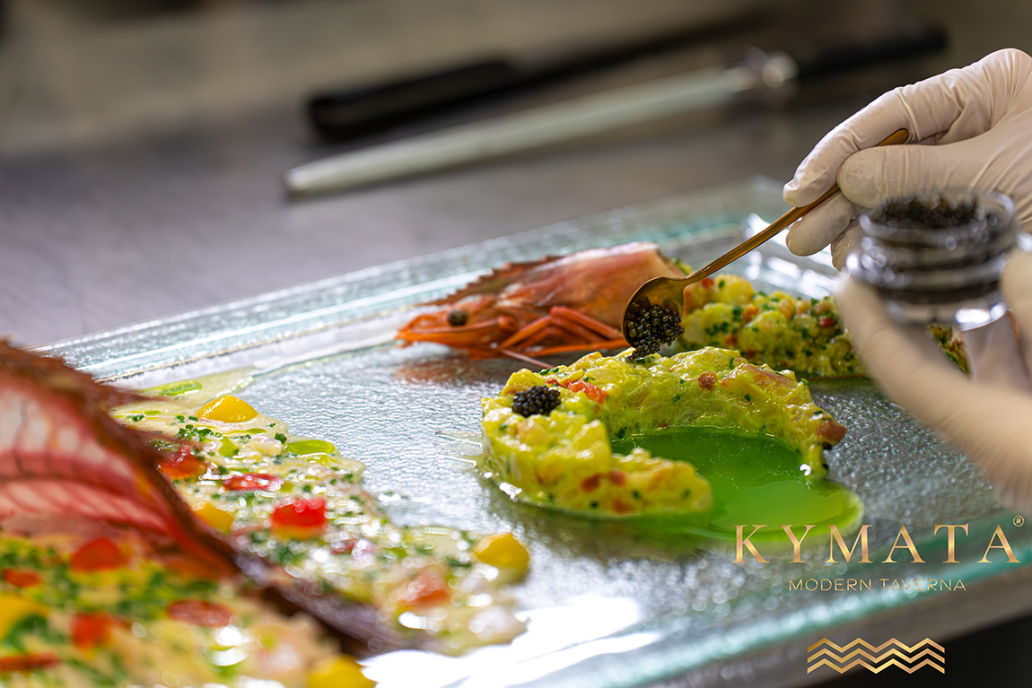 Das Herzstück von Kymata ist weiterhin die Küche. „Unsere Cross-Over-Küche verbindet kunstvoll traditionelle griechische Klassiker mit zeitgenössischen mediterranen Gerichten und verkörpert unser Motto, Tradition trifft Moderne”, erklärt Dimitrios.