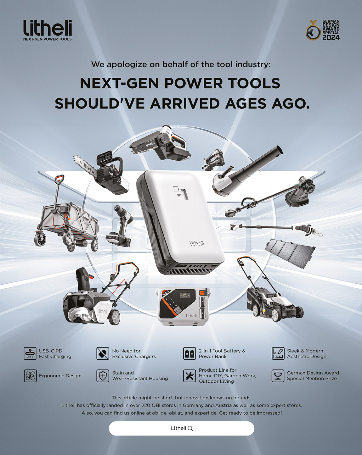 Das IPS-Modell erhielt viel Lob und Aufmerksamkeit auf der Eisenwarenmesse 2024 in Köln und wurde beim German Design Award 2024 für seine perfekte Mischung von innovativem Design und Funktionalität mit einer besonderen Erwähnung ausgezeichnet: „Die U-Battery (auch bekannt als IPS SUPER BATTERY) im Litheli Infinity Power Share Konzept verändert das Verhältnis von Akku und Werkzeuggerät komplett“, urteilte die Jury. Bevorzugt geladen mit erneuerbarem Strom, dient die U-Battery entweder als Powerbank oder versorgt eine Vielzahl von Geräten in Haushalt, Werkstatt und Garten.