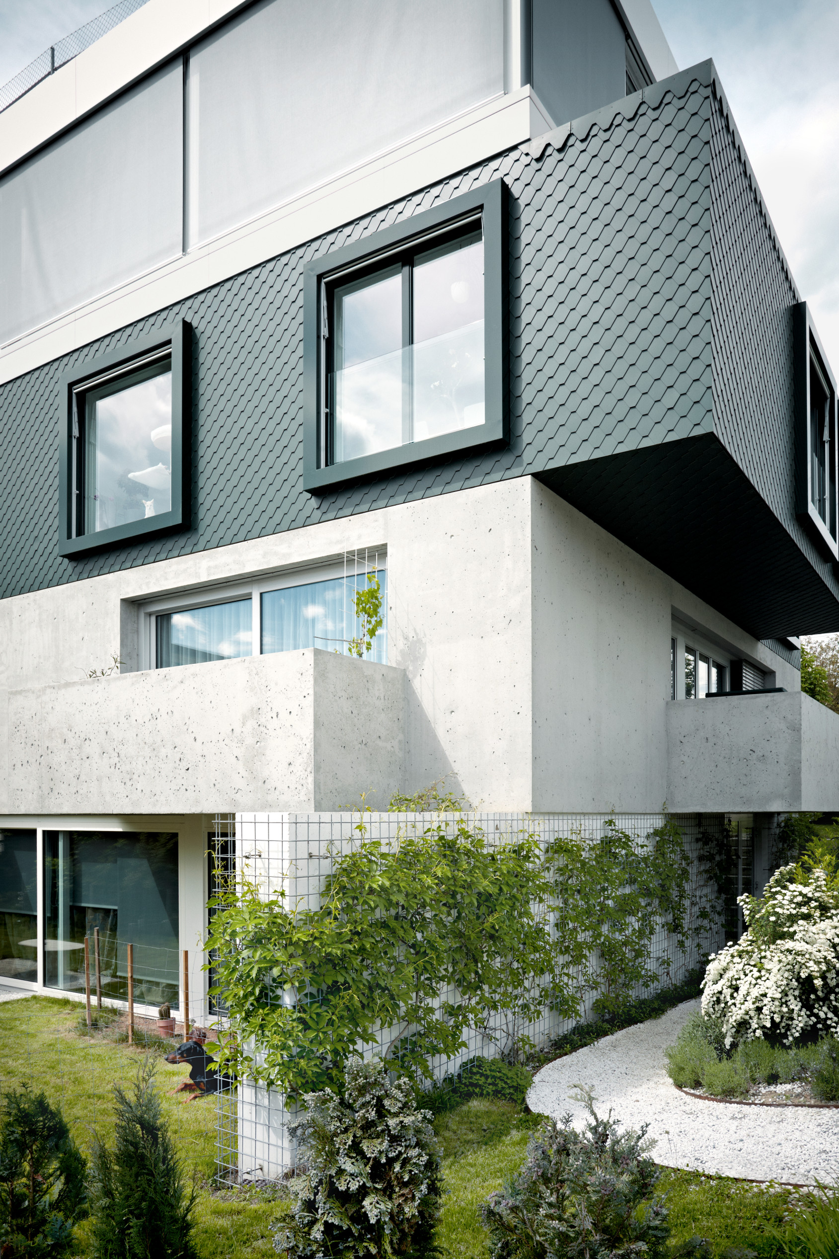 Concrete is the main component used to build ‘Fünf Häuser’ (Five Houses) but when looking at the façade, every storey seems different. From a grey concrete surface to a façade clad in green shingles, as reference to the colourful exteriors of classic single houses, every part stacked over another is rather individual.