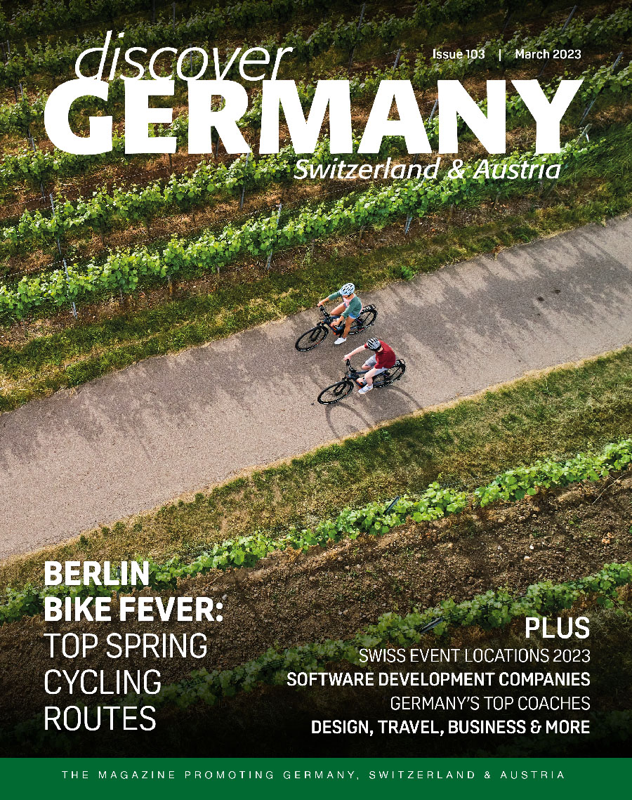 The March issue of Discover Germany, Austria & Switzerland introduces five perfect places to bike to this springtime, as well as the famous Wartburg Castle and its cultural legacy. Other topics covered are an interview with actor Bernhard Bettermann, some brightly coloured and airy spring outfits in this month’s Fashion Finds, top event locations in Switzerland, the popular Berlinale event, healthcare solutions, top coaches, 3D-printing technology, software development companies, education providers and much more.
