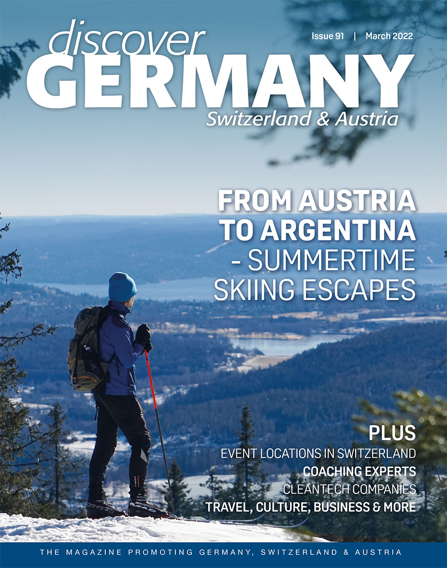 The March issue of Discover Germany, Austria & Switzerland features destinations that impress with snow-filled slopes even in summer, an interview with actress Peggy Lukac, Swiss event locations, culinary treats from Switzerland, coaching experts, top hotels, language schools, innovative cleantech companies as well as some of Germany’s and Austria’s finest wine producers.
