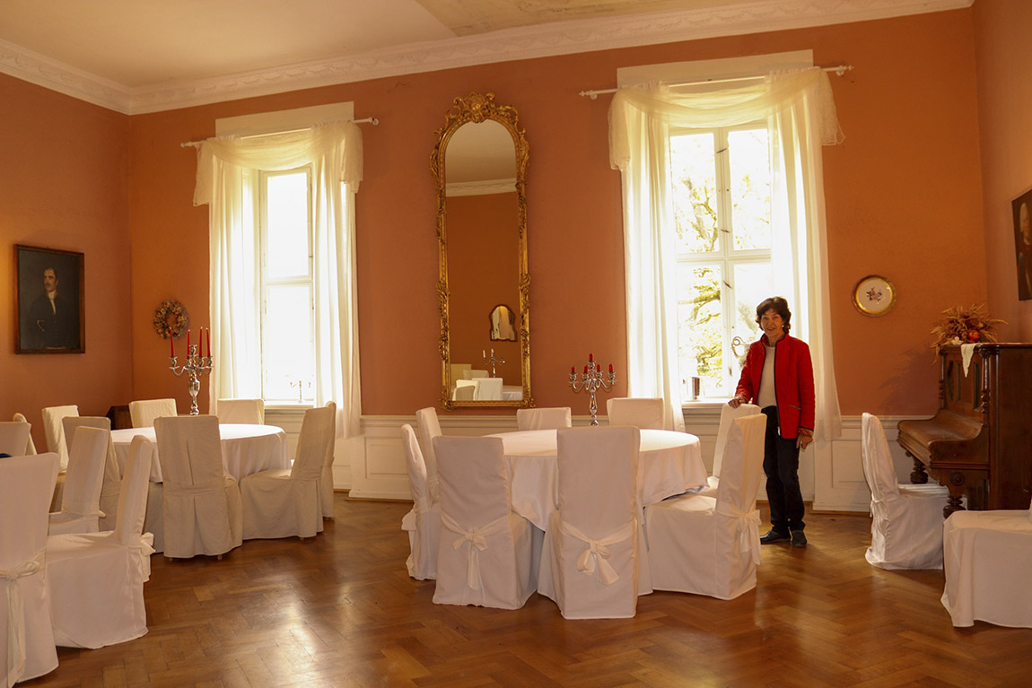 Eigentümerin und Gastgeberin Ilse von Schönberg stellt die Räume und das Mobiliar zu Verfügung, bei schönem Wetter gerne auch Stehtische, Zelt etc. für eine Feier unter den ausladenden Bäumen des Parks.