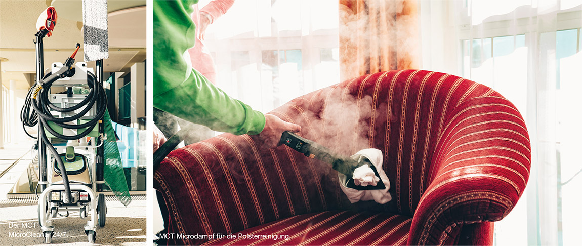 Entsprechend arbeitet das Hochleistungsreinigungsgerät ‚MTC Micro Cleaner 24/7‘ nur mit Microtrockendampf und reinigt und desinfiziert auf thermodynamischer Basis. Schlechte Gerüche werden auf natürliche Weise ebenfalls eliminiert. Von der Decke bis zum Boden, für alle Materialien und Oberflächen, braucht man nur noch ein Gerät. Das erleichtert die Arbeit und man ist zudem autark – nur ein bisschen Wasser und Strom wird gebraucht.