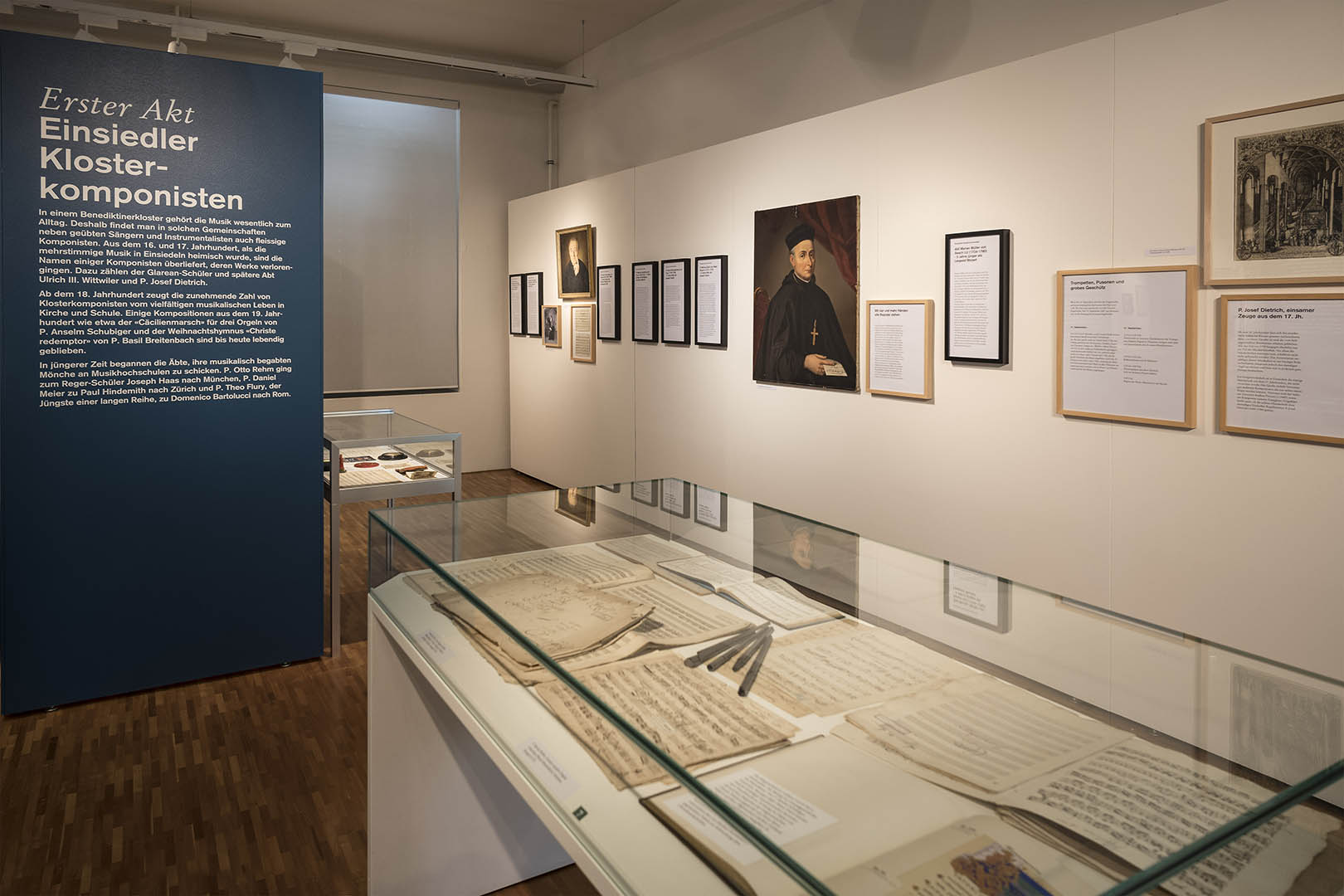 Seit dem 10. Jahrhundert lebt in Einsiedeln eine Mönchsgemeinschaft, die ihren Tagesablauf nach der Regel des heiligen Benedikt von Nursia gestaltet. Da in der benediktinischen Tradition ein Teil des täglichen Gebets gesungen wird, erstaunt es nicht, dass sich in einer über tausendjährigen Klostertradition ein riesiger Bestand an gesungener Gottesdienstmusik angesammelt hat. Viele dieser Werke wurden von klostereigenen Komponisten geschaffen, denen der erste Akt der Ausstellung gewidmet ist. Darunter finden sich Ulrich Wittwiler, Anselm Schubiger, Oswald Jaeggi, der Hindemith-Schüler Daniel Meier und der Bartolucci-Schüler Theo Flury (*1955).