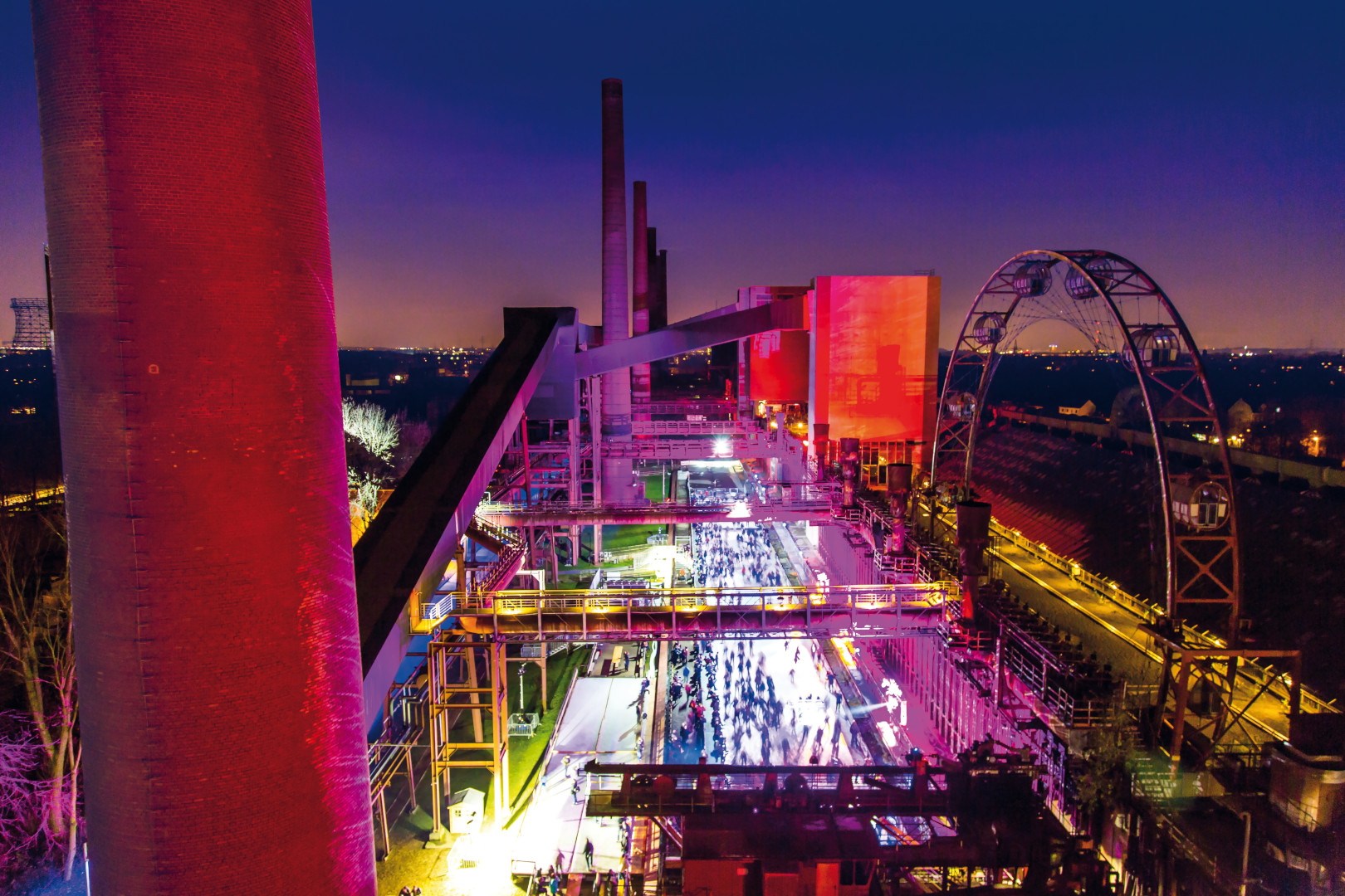 As of December, the water basin in the former pressing machine rail of the colliery ‘Zollverein’, an industrial UNESCO world heritage site in Essen at the heart of the Ruhr area, changes into the 150-metre-long ZOLLVEREIN® ice rink, thus offering ice skating fun for the whole family. Visitors skate alongside impressing coke ovens, rust red pipes and high chimneys. Marked as ‘probably the most fascinating place for ice skating nationwide’ (Marco Polo), the ice rink is illuminated by light installations after dark and a ‘winter village’ provides visitors with hot drinks and snacks.