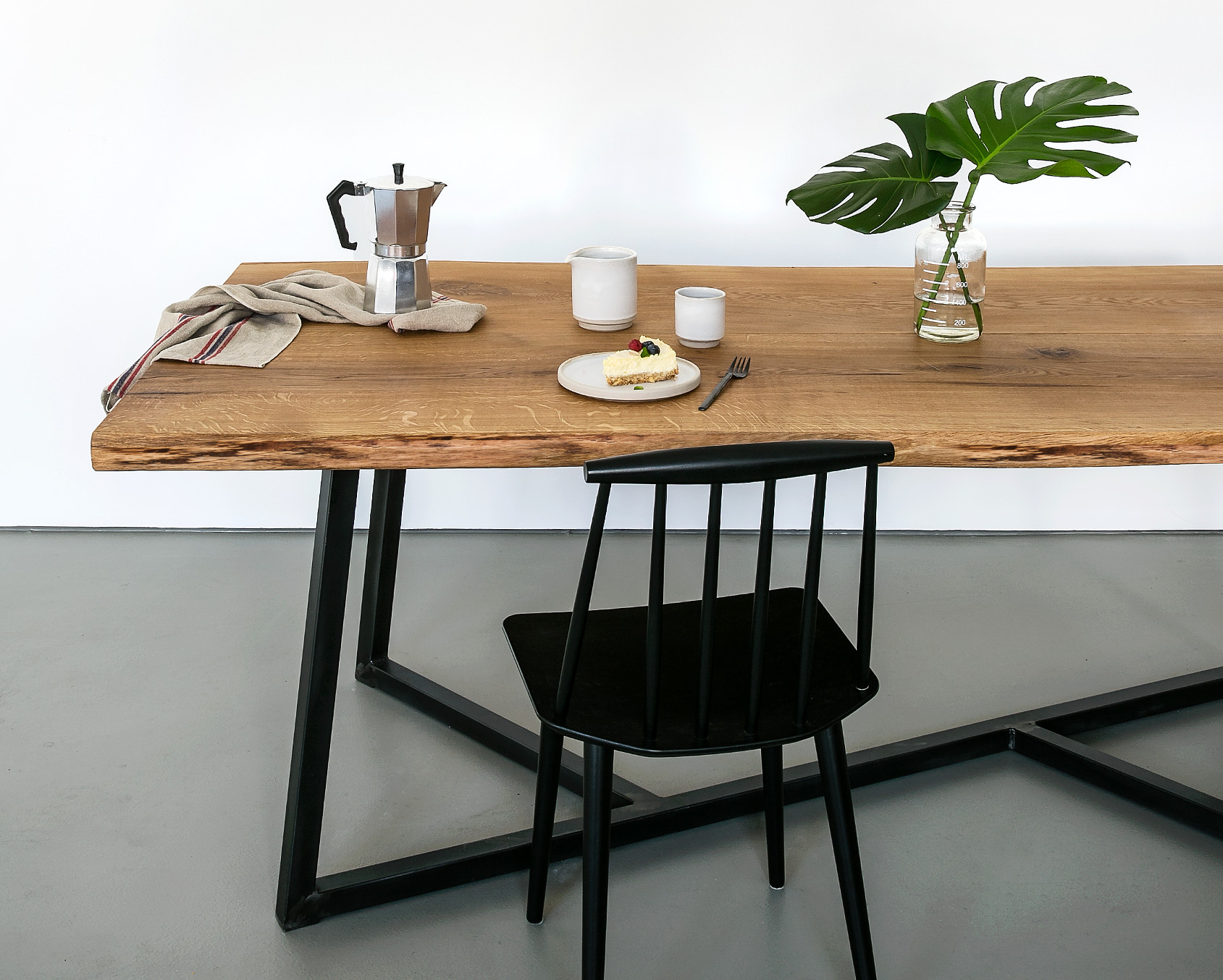 find a piece that met his expectations. Most tables he saw in furniture stores or in online shops had an industrial look and consisted of many small pieces of wood that were glued laminated.