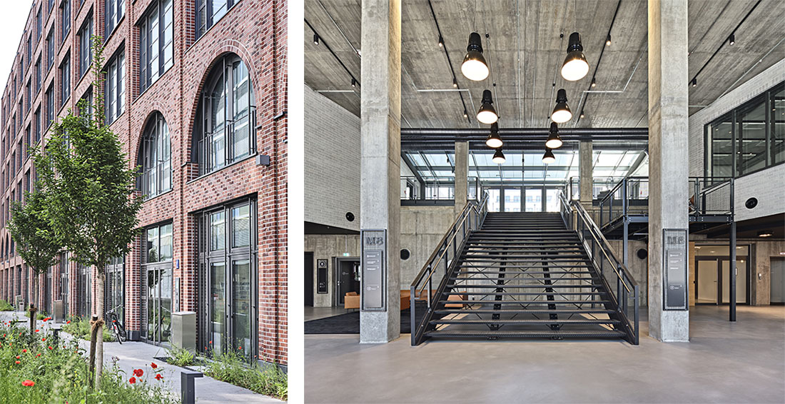 Links: Neubau Mühldorfstraße 8: Die strenge Leichtigkeit der Klinkerfassade. Foto: Edzard Probst für Oliv Architekten Rechts: Foyer Mühldorfstraße: Sichtbeton, schwarzer Stahl und schwarz-weiß Kontraste sind die Materialien im Innenraum. Foto: Edzard Probst für Oliv Architekten