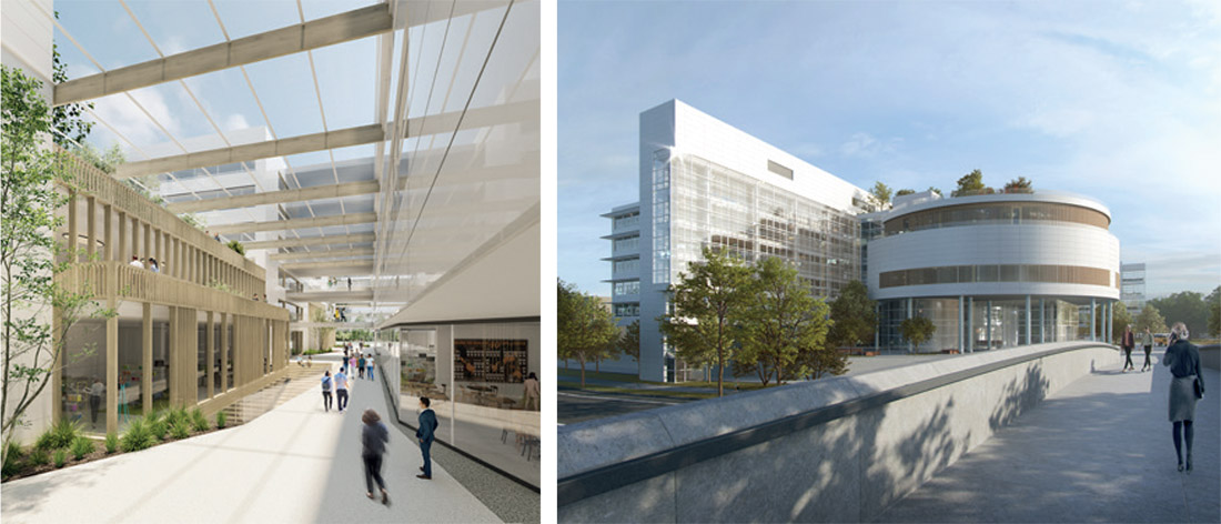 Links: Revitalisierung AER in München Neuperlach Neue Erschließungsmagistrale im AER und Nachverdichtung in Holzbauweise. Visualisierung: Oliv Architekten Rechts: Revitalisierung AER in München Neuperlach Umnutzung, Nachverdichtung und Aufstockung durch Holzhybridkonstruktionen im Bestand. Visualisierung: HEVF 2 Fritz 9 S.à r.l.