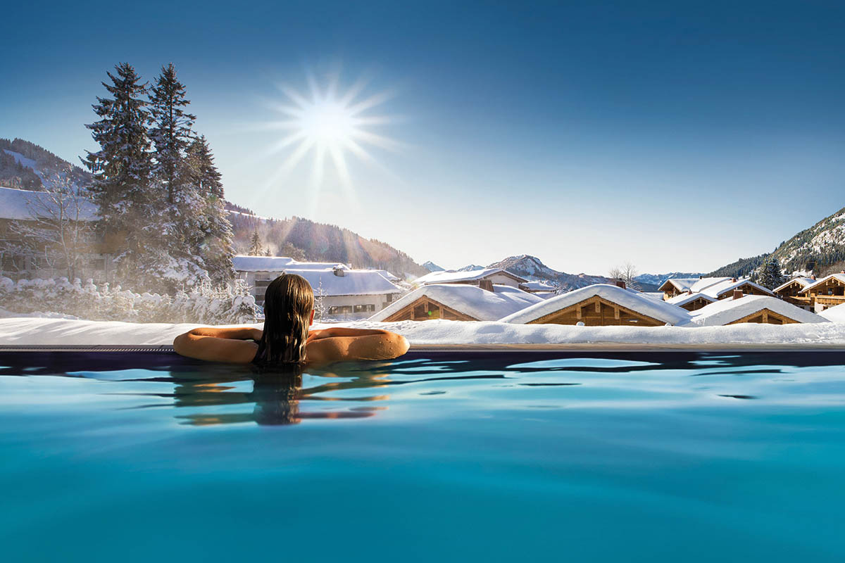Wer müde, kalt und mit schmerzenden Muskeln von der Piste zurückkommt, kann sich im 3000 Quadratmeter großen Alpin-SPA erholen, die stündlichen Aufgüsse in der Saunalandschaft genießen oder stundenlang im ganzjährig beheizten Innen- und Außenpool schweben – mit Blick über die verschneiten Dächer der Chalets und die umgebenden Berge.