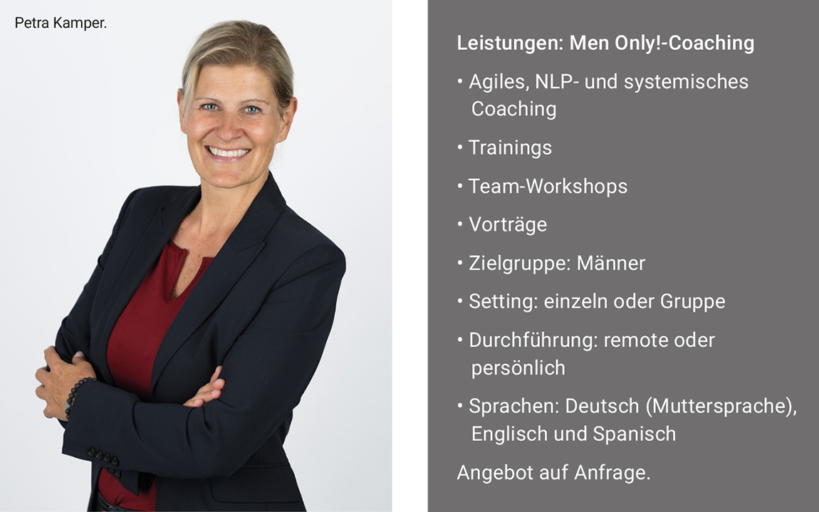 „Es war nicht von Anfang an der Plan, Coach für Männer zu werden”, erzählt Petra Kamper lächelnd. „Aber der Zufall wollte es, dass ich seit Jahren in männerdominierten Branchen tätig war und ich gerade in den Bereichen Healthcare Technology, Energie & E-Mobilität und Automotive enorm viel über Männer als Mitarbeitende aber auch als Führungskräfte lernen durfte. Da bemerkte ich, es machte mir enorm viel Freude und Spaß, Männer im beruflichen Kontext zu unterstützen, und ich bekam darüber hinaus sehr gutes Feedback für meinen Einsatz.“