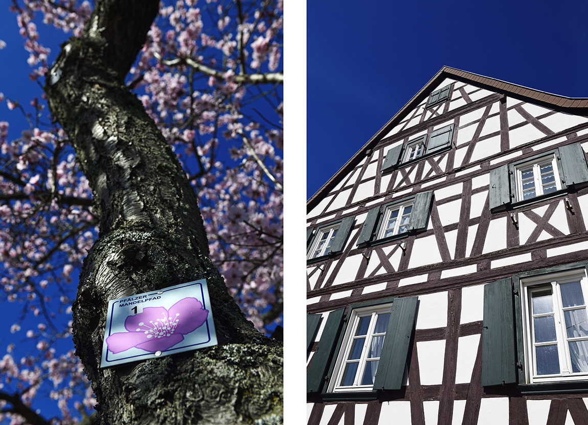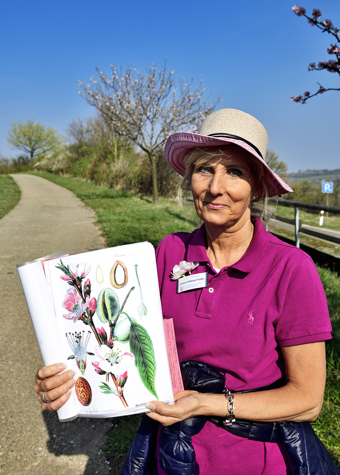 Inspired we drive a little south again to the Leinsweiler Hof to meet the culture and wine ambassador Gudrun Stübinger-Kohls there. Her almond tour starts under a sprawling almond tree in the parking lot of the wellness hotel. “The Mandelpfad was opened in March 2008 and initially ran from Maikammer to Leinsweiler. But it has been continuously expanded and today extends from Bad Dürkheim to the German Wine Gate near Silence-Rechtenbach on the border with Alsace,” she explains as she already plucks a few flowers from the tree and lets us sniff them. “There are around 30 types of almonds. The trees can live up to 60 years. Who knows what colour the bitter almond flowers are? White or pink?”