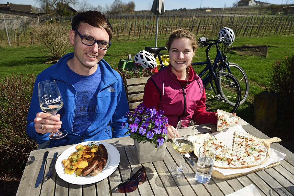 We boldly venture into an opulent portion of German cultural history. The Palatinate ‘Saumagen’, which our ex-Chancellor Helmut Kohl loved so much and spread the news about so openly all over the world, really surprises us. Given the crude name, we were prepared for a very heavy, medieval meal. But no, the Saumagen, which translates to ‘sow’s stomach’, is not a monumental mountain of meat. It is served in slices. Pork, potatoes and vegetables are delicately seasoned and fried on both sides. Very delicate, a real treat and definitely not too rustic. The heavy hit of sauerkraut that is served with it ensures this. Of course, this isn’t a snack for the WeightWatchers, but it tastes great after a cycling tour like this. And as a matter of course in the Palatinate, a glass of white wine is served with it. But be careful, if you order a pint, you will usually get a whopping 0.5 litres in the Palatinate. We also enjoy a stunning view of the Palatinate Forest from the wooden tables outside. The mixed forests on the slopes still seem a bit bare and the vines that grow up the slopes in all places are just getting started again, but at these temperatures the flora will soon completely awaken from hibernation.