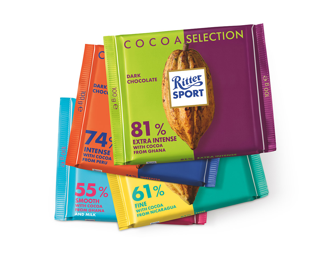 A couple of years ago, Ritter Sport introduced its ‘Cocoa Selection’ in order to make people aware of the many flavours these ‘hidden champions’ amongst natural raw materials can develop. While the bars’ four simple recipes underline the individual character of the cocoa, each from a different origin country, this Cocoa Selection is not just part of the product range but also serves as evidence of the great cocoa expertise the family business has acquired over the years.