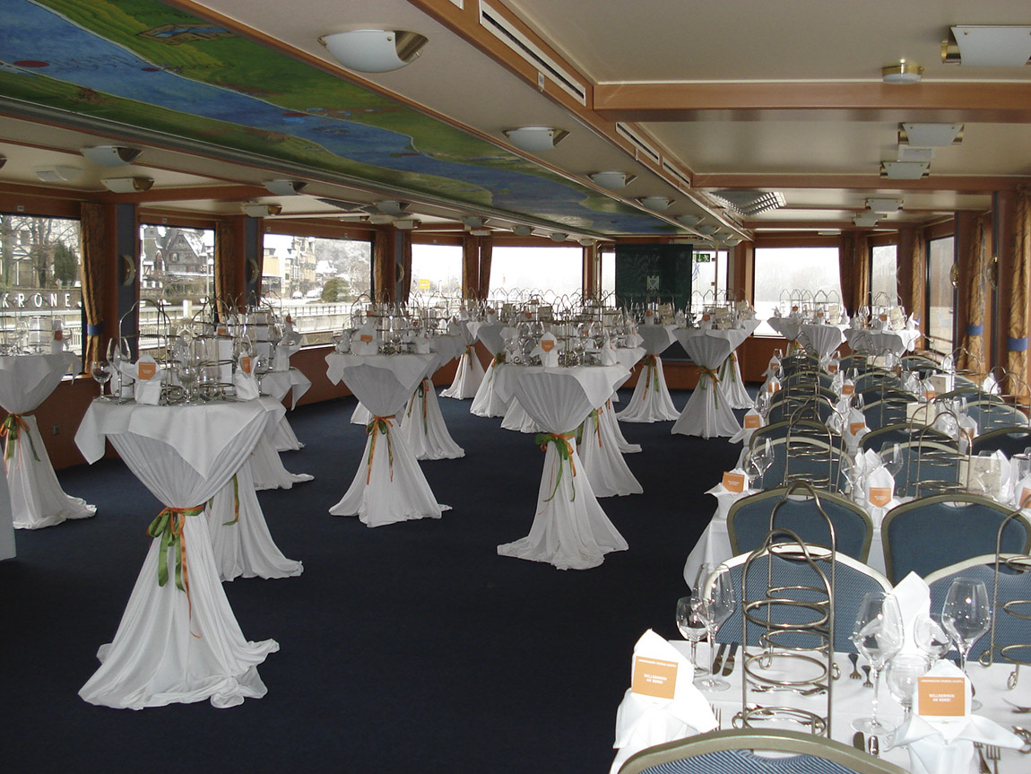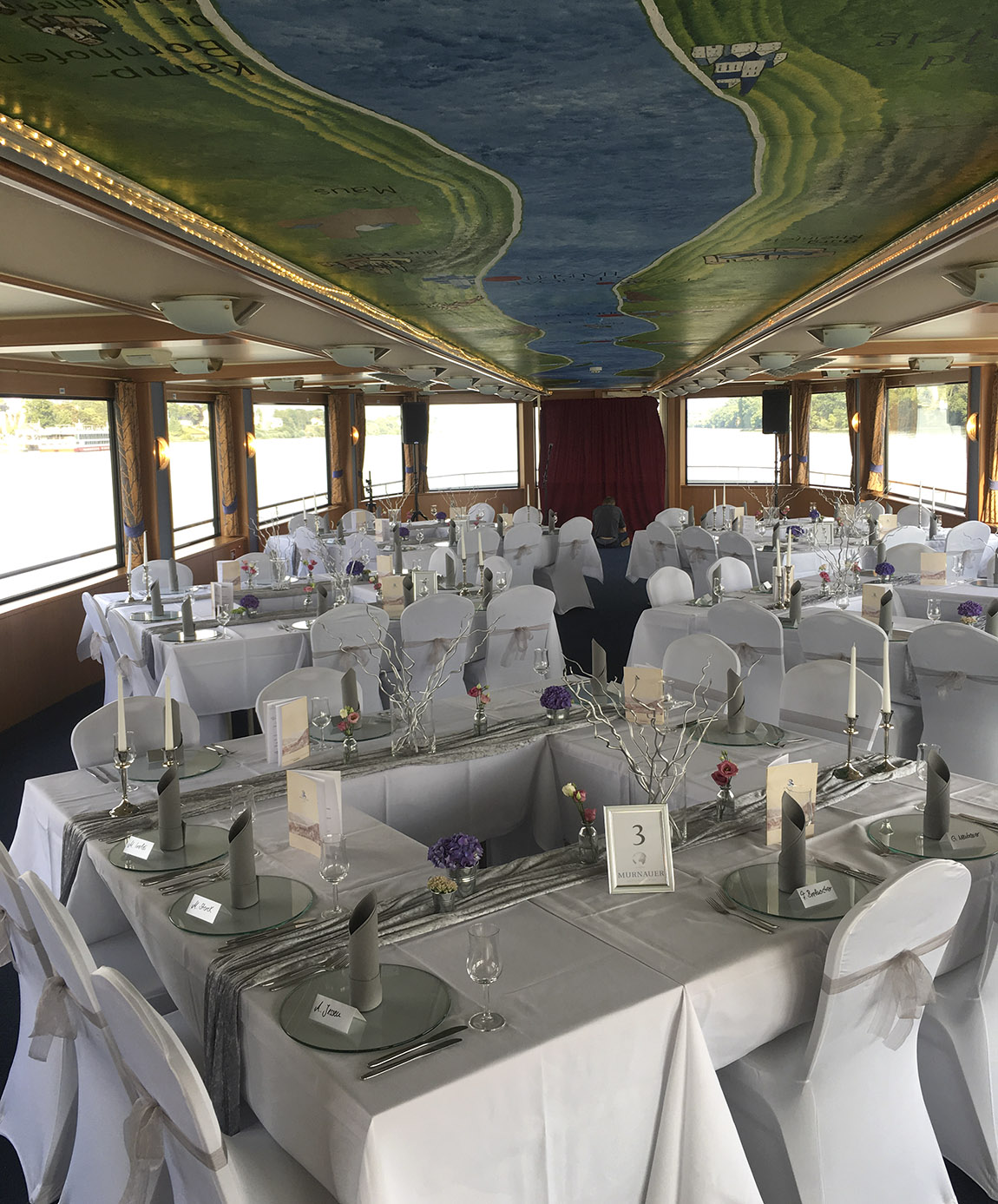 Die vier verschiedenen Schiffe bringen jeweils ein anderes Ambiente und haben Kapazitäten für zwischen 20 und 600 Gäste. Dabei kommt alles aus einer Hand: von der Deko über Musik oder auch Animation richtet sich das Rössler-Team ganz nach den individuellen Wünschen der Gäste – auch in Sachen Catering. „Vieles kommt durch die bordeigene Küche“, so Rössler. „Wir arbeiten aber auch mit verschiedenen Caterern zusammen.“