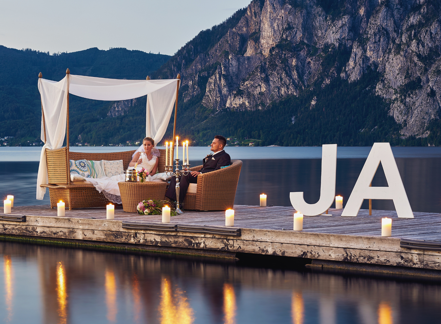 If you are looking for a truly unique wedding location, why not consider Austria’s Salzkammergut? With clear lakes, high mountains and green meadows, the resort area near Salzburg certainly offers a beautiful backdrop. Even better: wedding planner Gabi Socher and her team of dedicated service professionals will take care of everything. All you need to do is sit back, relax and say yes. As one of the first wedding planners in Austria, Gabi Socher has led more than 450 wedding couples to the altar since 1999. Throughout those years she has found out about many great, sometimes even hidden wedding locations, wedding activities and service professionals in the Salzkammergut region. This led to the foundation of the ‘sagJA-im-Salzkammergut’ (translation: ‘say yes in the Salzkammergut region’) project – a professional network of various wedding service providers such as restaurants, graphic designers, florists, musicians or photographers.