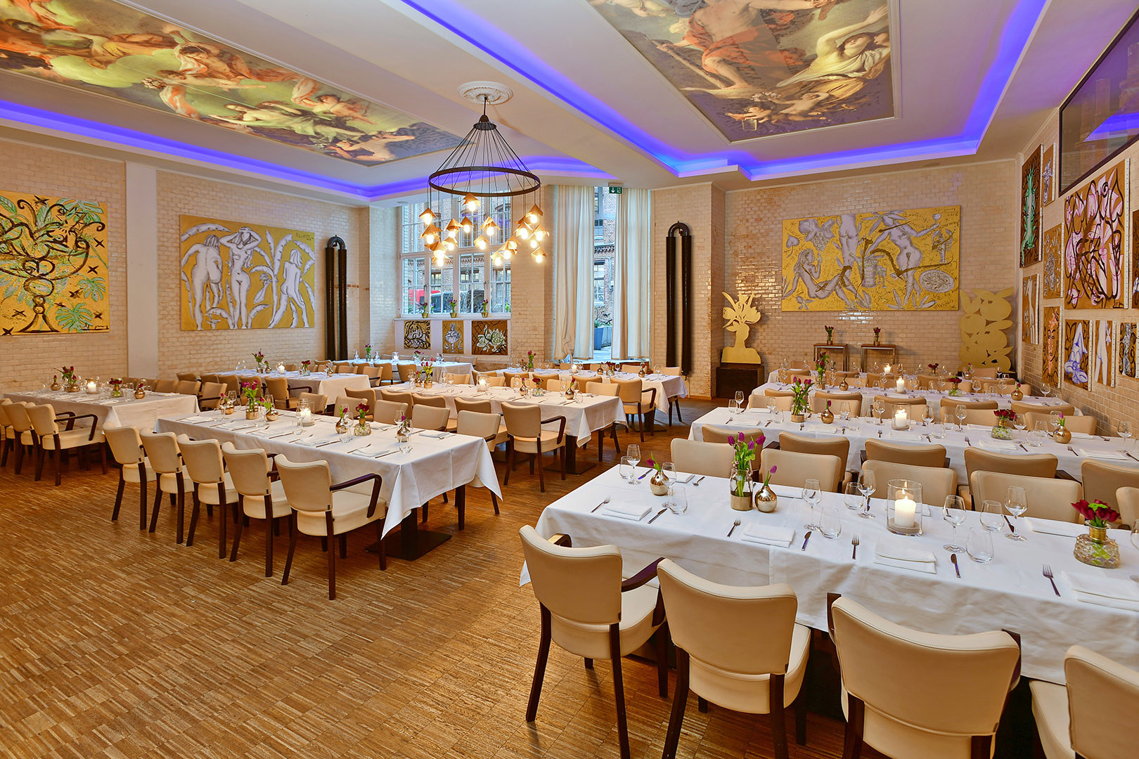 Großzügige Fenster, Parkett und Kronleuchter unterstreichen den Charme des Festsaals. Historische Industriearchitektur trifft auf die Werke des in Saint-Tropez beheimateten Künstlers Stefan Szczesny und bilden eine gelungene Symbiose aus Sinnlichkeit und Funktionalität. Die großzügige Bar bietet Platz für den Empfang und Ausklang des Abends. Eine weitläufige, begrünte Terrasse im Innenhof mit direktem Zugang zum Saal kann individuell bestuhlt und als Eventlandschaft gestaltet werden.
