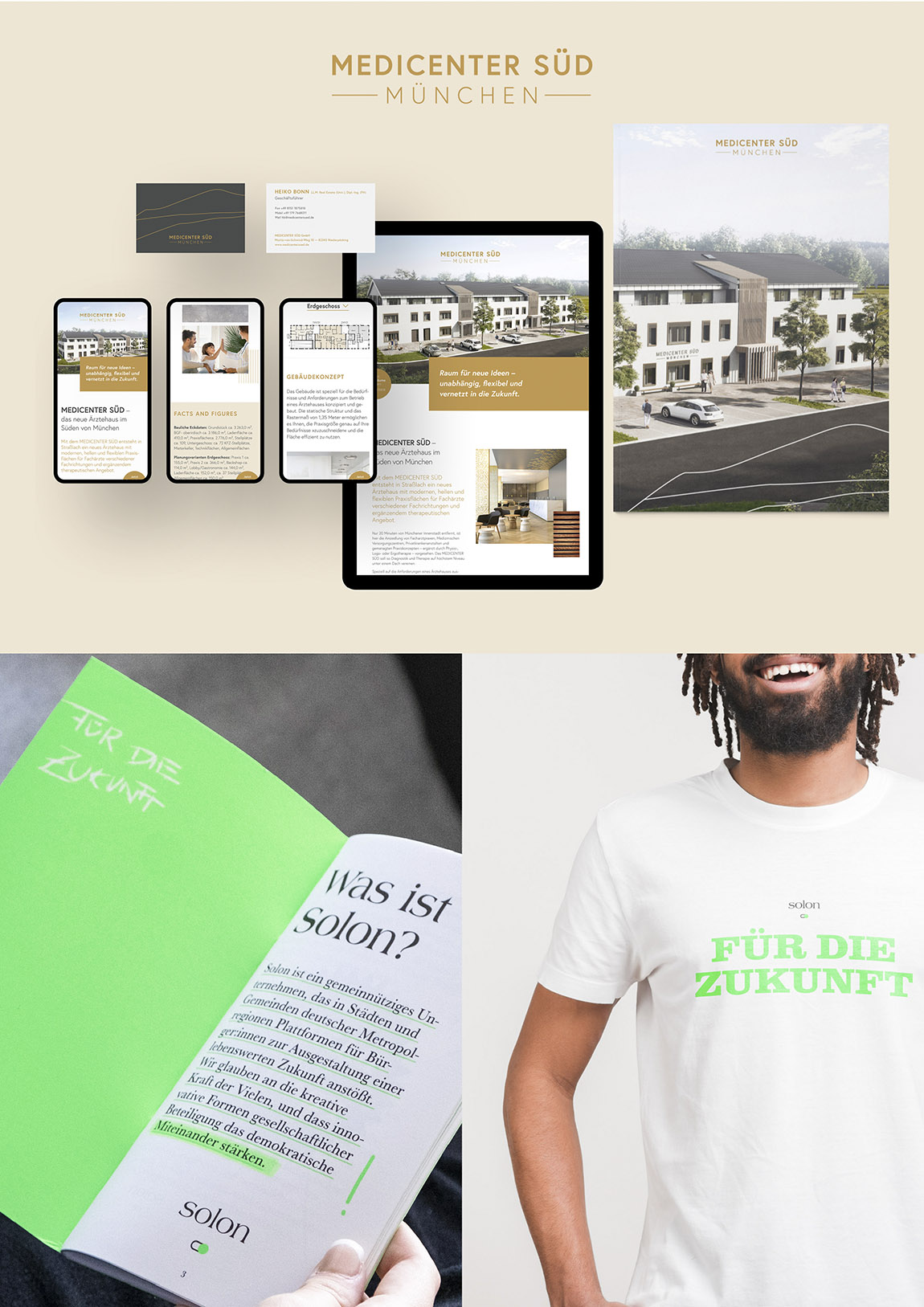 Corporate Design und Website für die Immobilie ‚Medicenter Süd’ / Unten: Markenentwicklung für die gemeinnützige Solon gGmbH.