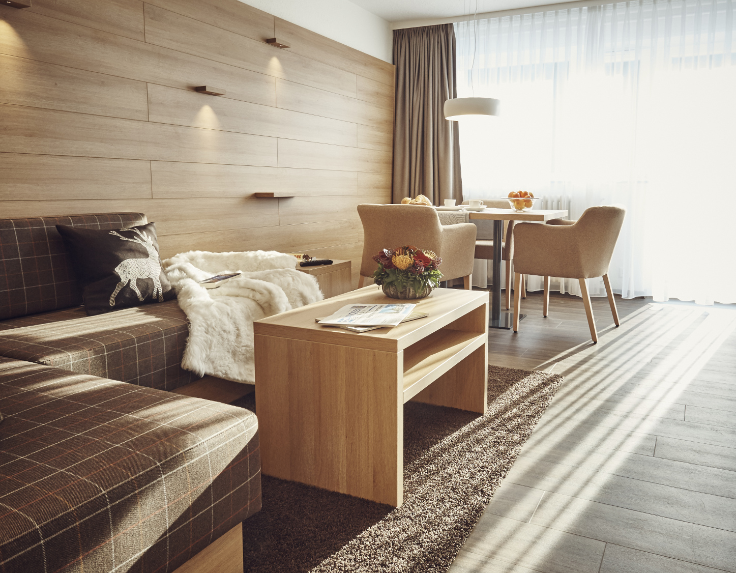 “We are personal, dependable and honest. That is what makes our guests feel at home,”says Stephan Huber, whose father-in-law built Solaria in the 1970s. With a team of seven, including family members, as well as 25 cleaners, Huber manages the 75 serviced apartments and houses that can be rented by anyone from a couple of friends to a family of seven, amounting to 220 beds in total.“We offer a huge variety, including detached houses for just two peo-ple,” says Huber. All of the apartments are homogeneously furnished, competitively priced and benefit from a sunny, quiet location near the town centre.