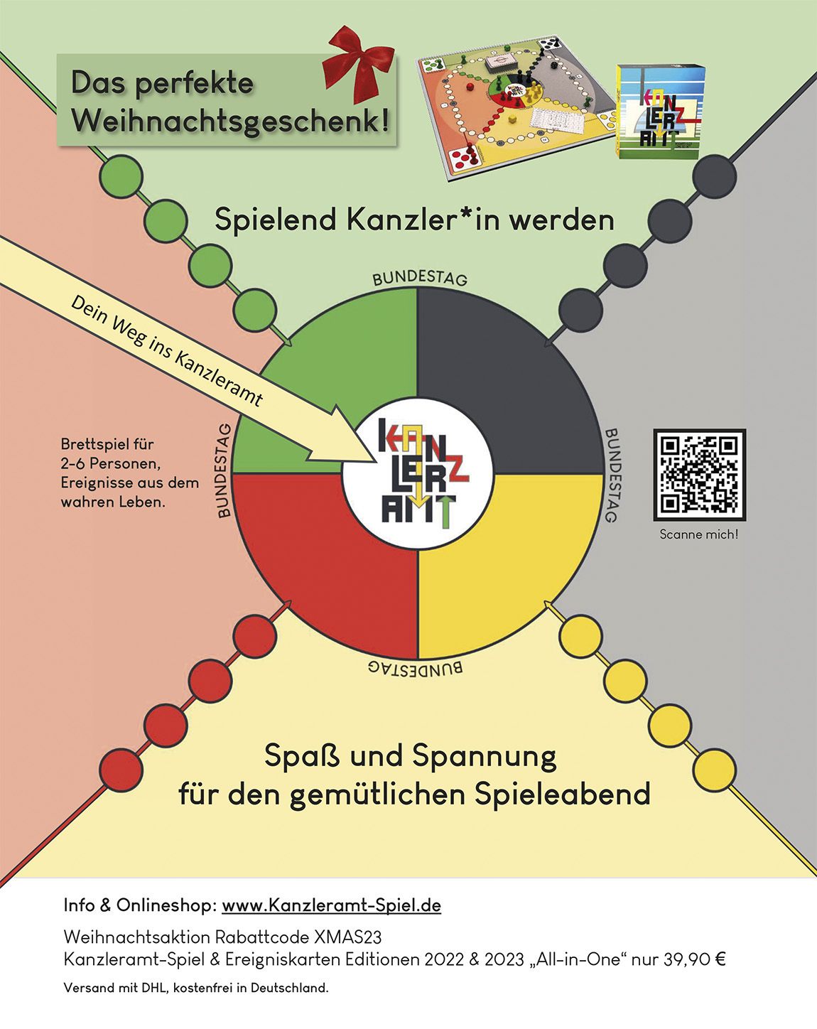 Damit ist das Kanzleramt-Spiel das ideale Weihnachtsgeschenk, das für so manchen gemütlichen Spieleabend unter dem Weihnachtsbaum sorgen wird.
