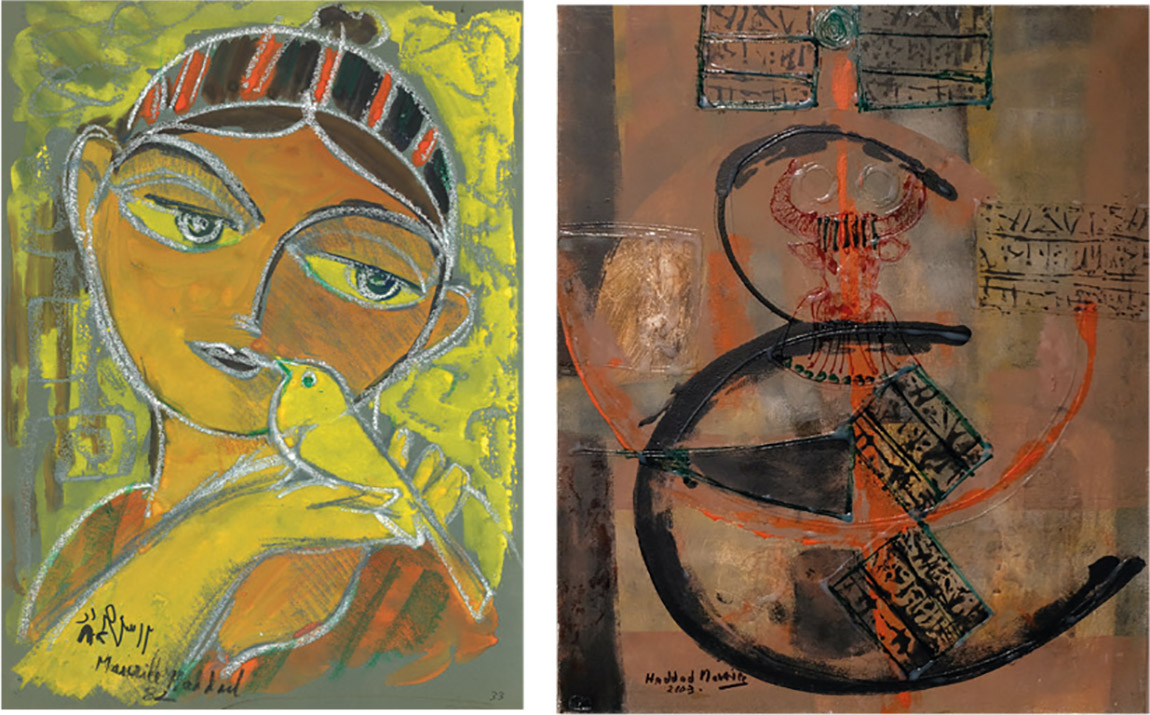 Left: Talking with Bird. Photo: Courtesy of Maurice Haddad. Right: Gilgamesh II. Photo: Courtesy of Maurice Haddad