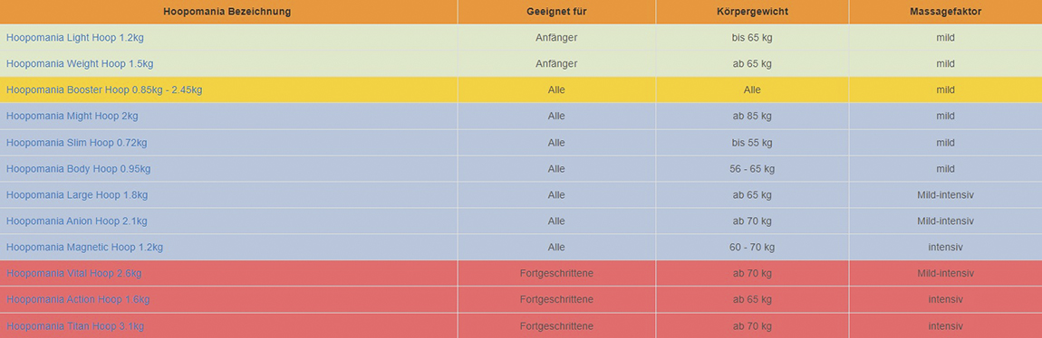 Die Tabelle dient lediglich als grobe Richtlinie zur Wahl des individuellen Hoopomania Hoops.