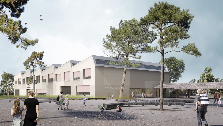 The Schaffhausen school premises date back to the ‘50s and the new building structures the exteriors into spaces of differentiated qualities. The low, calm volume and the pattern of parallel roofs form a continuum of the surrounding public buildings. Straying from the original competition parameters, a canopied recreation hall was preserved and will be connected to the new structure. To be finished in 2019, the building’s distinctive shed roofs allow natural lighting of the upper levels for all classrooms and access areas.