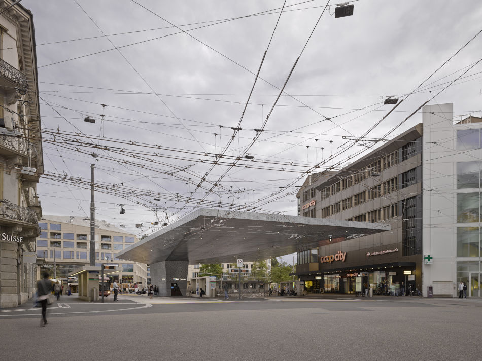 Strategically placed, the limited space of the Winterthur Station Square is shared by masses of pedestrians (up to 100,000 per day) and also functions as a central bus station. The precisely designed, hovering roof visually unites the busy life underneath and helps structuring the square, calming it down. Grounding the structure, the asymmetrically positioned support ‘foot’ also houses the bus ticket booth, while an existent subway was conversed to provide resting spaces for the drivers. The futuristic design of the canopy roof features a glass top, while the underside is made of lasered aluminium. Leaving enough air space, the design provides a visual focus as well as clearing the formerly obstructed view on the Winterthur Old Town.