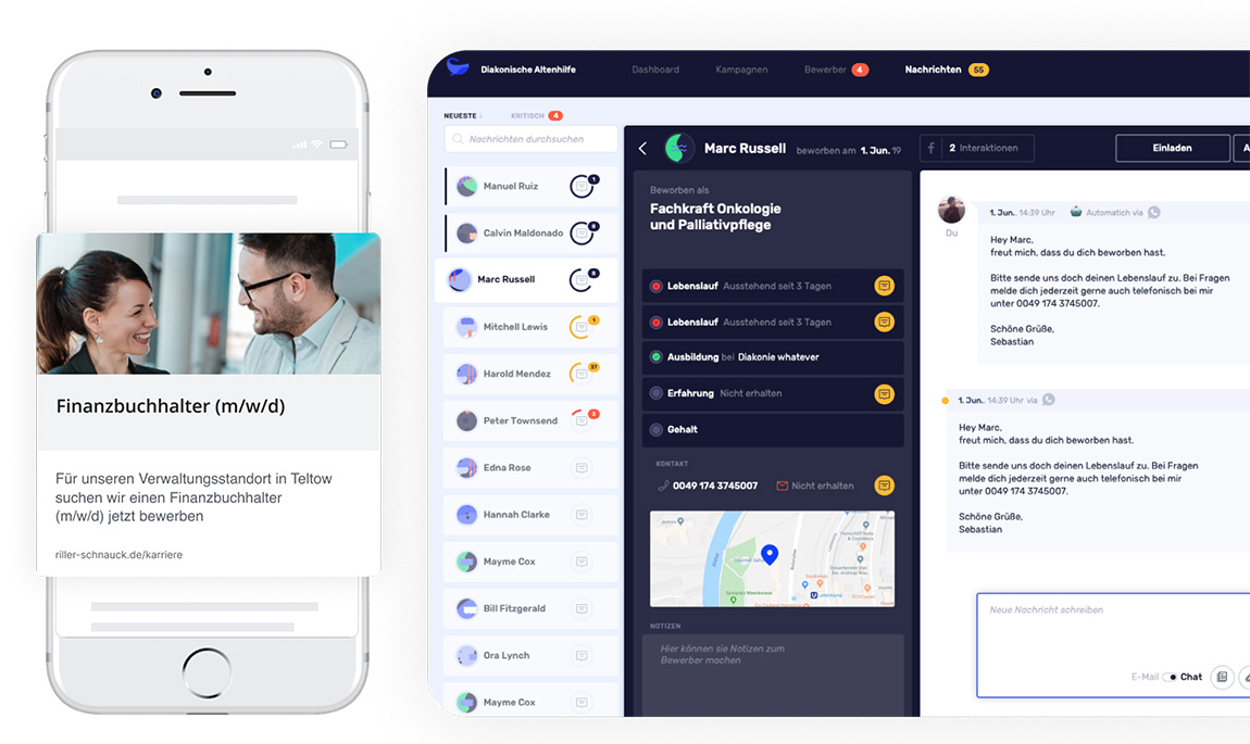 Ein Blick in die TalentBait-Software: Während BewerberInnen Nachrichten direkt auf ihr Smartphone erhalten, arbeiten Unternehmen im sog. BewerberHub.