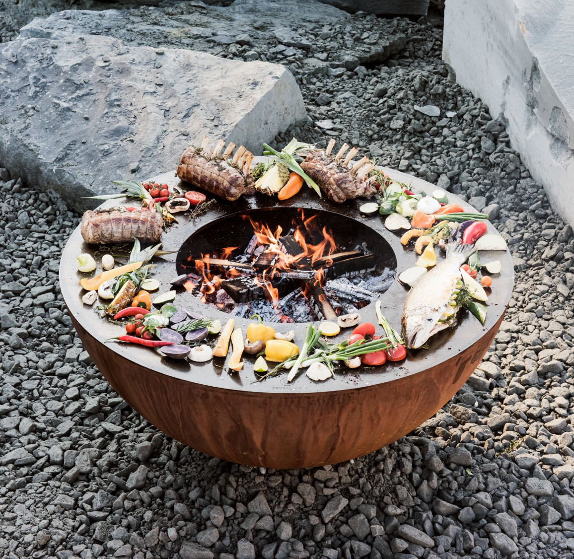 Simple and elegant design, sculptural aesthetics and a sensual accent: Who would think that these words are associated with a barbeque? However, the Feuerring is not only a healthy grilling device, but also an exceptional design object for outdoor spaces. Also functioning as a cosy fireplace, it seeks to celebrate conviviality, indulgence and pleasure in creativity. “The Feuerring is the patented original; a grilling device with which you can indirectly grill on a steel ring next to a crackling fire. One simultaneously enjoys convivial gatherings with guests, puts special emphasis on indulgence and good preparation of valuable ingredients and also lives with the strength and creative energy of an archaic fire,”Andreas Reichlin, inventor of the Feuerring, says.