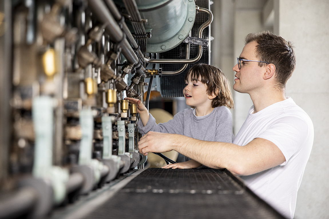 Father and son exploring the engine of the Gorch Fock.