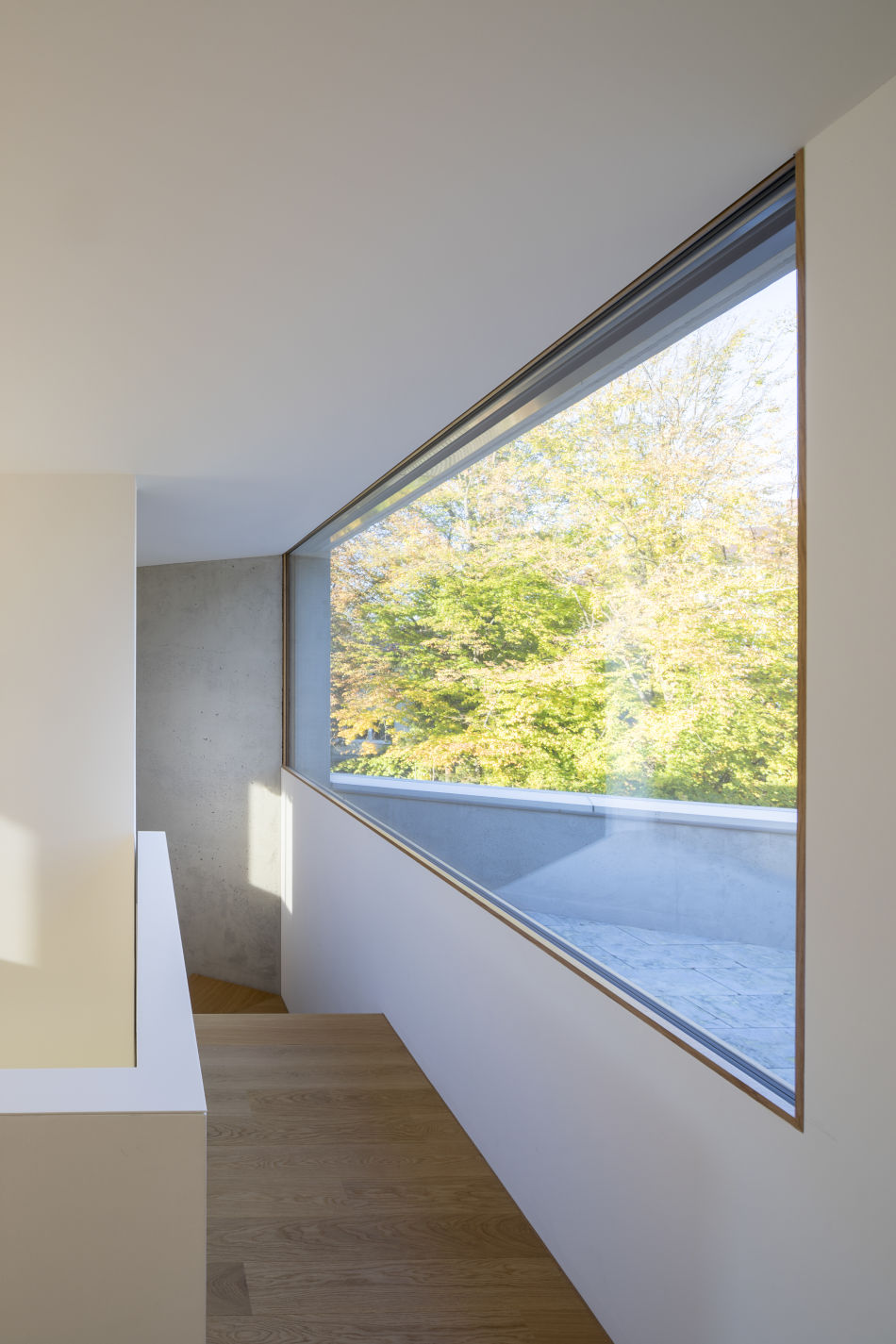 Die Fensteröffnung der zum Nachbargebäude ausgerichteten Fassadenseite befindet sich auf Kniehöhe, während eine raumhohe Verglasung das Haus zum Garten hin öffnet. Man ist somit abgeschirmt und hat dennoch viel natürliches Licht. Die Räumlichkeiten ermöglichen so den Blick vom Esstisch zum eigenen Garten, ohne vom Nachbarhaus her einsehbar zu sein. Außerdem bekommt der Raum und das Gefühl wie man sich darin bewegt, eine ganz klare Richtung, wie Unterlandstättner erklärt, nämlich nach Süden und zur eigenen Terrasse hin.