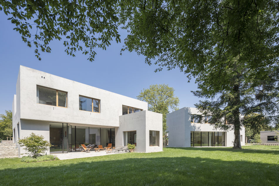 Ein weiteres durchdachtes Beispiel für die Architektur des Münchner Büros ist das Monolithische Ensemble. Hier handelt es sich um zwei Villen aus Infraleichtbeton. Die Innenseiten der Außenwände wurden in Sichtbeton belassen, wodurch die monolithische Bauweise und die Raumstrukturen auch innerhalb der Gebäude erlebbar bleiben. In der Ausführung wurde auf eine homogene Auswahl an Materialien sowie eine nachhaltige Gebäudetechnik geachtet: Die Beheizung beider Gebäude per Grundwasserwärmepumpe, eine Perimeterdämmung durch Glasschaumschotter aus Altglas sowie extensiv begrünte Dachflächen mit vor Ort versickerndem Dach- und Oberflächenwasser sprechen für sich.