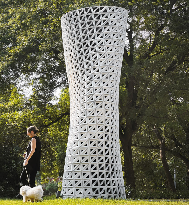 “VERTO is a multi-directional, 360-degree air filtration tower that we have developed with German filtration specialist MANN+HUMMEL for a cleaner, healthier future. It cleans the air of the ultrafine particles that are harmful to human health (PM 2.5, PM 10, NO2),” explains Britta Knobel Gupta, founding partner of Studio Symbiosis. She adds: “By the way, VERTOs name says it all. It derives its name from the Latin ‘vertere’ – to turn: as the tower rises, it transforms the polluted air in the area into clean air.