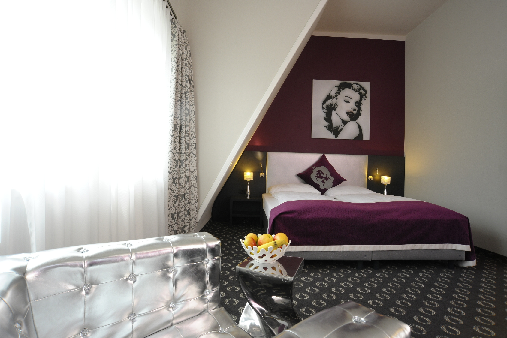 To be able to call yourself a boutique hotel,the house must be managed by the owner himself, prove an authentic and historical background and be equipped individually. At the Hotel Villa Carlton every floor is designed according to a different theme. The ground-floor, for example, captivates visitors with a distinctive royal blue,while the third floor which is also called ‘Klimbim’ – a German expression for odds and ends – distinguishes itself with glitter décor, pop art and exquisite furniture. This unique design, as well as carrying owner Anna Sunshine Sigl’s personal thumbprint, is what sets the Villa Carlton apart from other hotels.