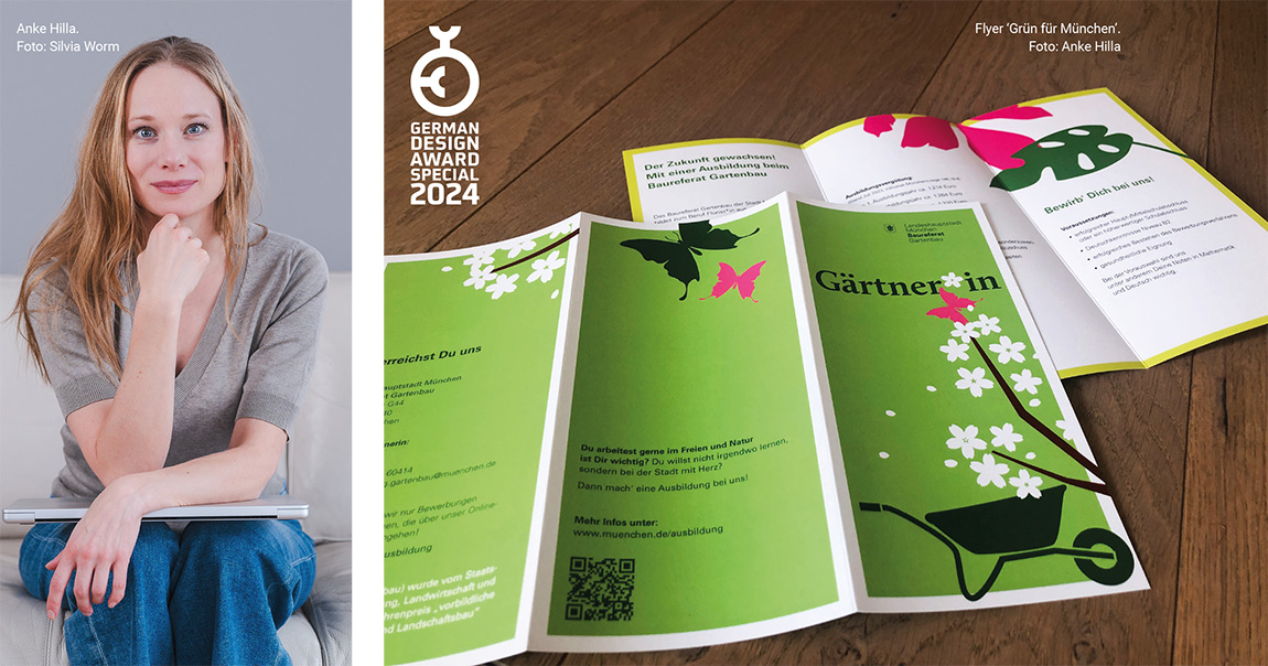 Today, Anke Hilla is focused on corporate and information design, and her unique combination of strong communication concepts and intercultural experience has already brought her much recognition in the design world. This includes, for example, the German Design Award 2024 Special Mention in the category Excellent Communications Design – Poster Cards and Photography for designing a poster and flyer series for the Munich City Gardening Department. She’d already received this award in 2016 in the Excellent Communication Design – Digital Media and Online category for designing and implementing a quarterly digital customer magazine for mobile devices.