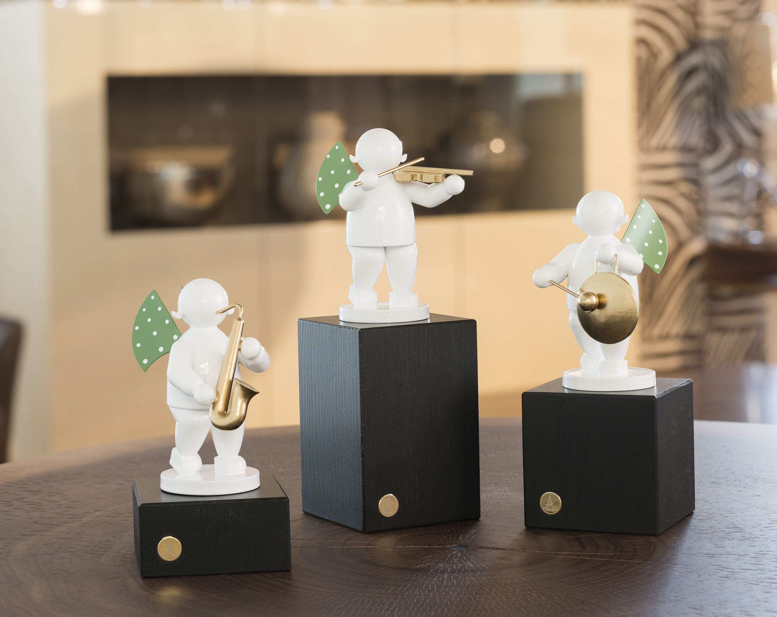 excellence. A pure, brilliant white accentuates the distinctive design vocabulary of Wendt & Kuehn’s angels and emphasises their trademark – the green wings with 11 white dots.