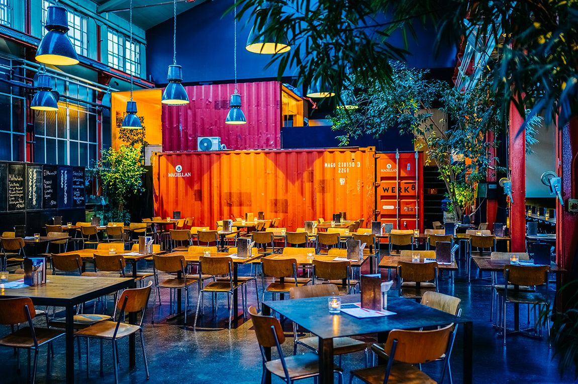 The ambience at WERK 8 helps to make every visit a relaxed experience, whether at the bar, in the restaurant or at an event. “Visually, we are divided into a lounge area and an area with classic restaurant seating. But that’s not set in stone. Guests can sit on a sofa and enjoy their dinner, or sit at a table and order a cocktail. You can feel the relaxed atmosphere throughout the room,” continues the manager. “Next to the table of two romantic lovebirds, you might find a group of 15 people celebrating a wedding-eve-party or 80 guests celebrating a birthday. Everything is a colourful mix and happens side by side.”